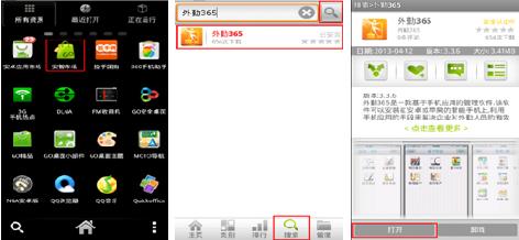 我们以安卓市场为例。首先手机上必须安装安卓市场客户端软件,选择“安卓市场”进入软件;选择“搜索”,在搜索栏中输入“外勤365”,点击搜索;在软件列表中,点击“下载”,下载完成后,点击“安装”;安装完成后,可在手机软件中,找到外勤365软件。