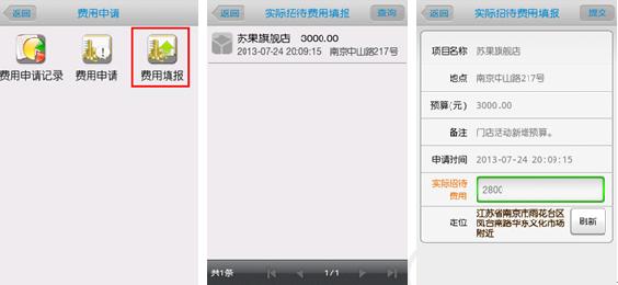 业务员在手机上选择【费用填报】,此时,清单中会列出领导审批通过的费用申请数据,选择需要填报的数据,填写实际使用金额并上报费用使用的地点信息;