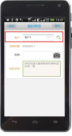 如何利用外勤365软件来对业务员日常工作进行监督呢,其实很简单,首先需要在员工的手机上安装外勤365软件,软件里有一个“客户拜访管理”的功能。可以要求业务员在拜访客户时,在客户现场或者门口用手机填写以下拜访记录,如下图所示。