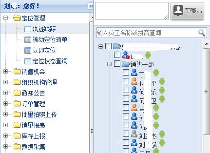 进入外勤365的后台页面,在定位管理菜单中选择轨迹跟踪后,可以选择您想跟踪的员工,如下图所示