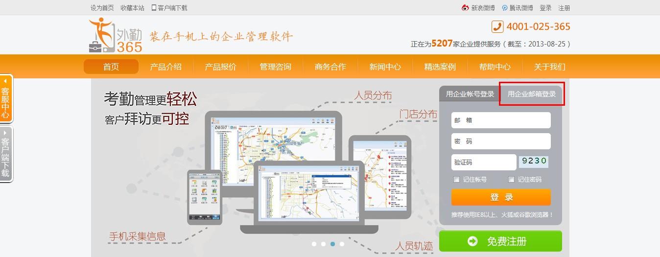 在外勤365官网,选择“用企业邮箱登录”,输入邮箱和密码,即可登录到外勤365系统;