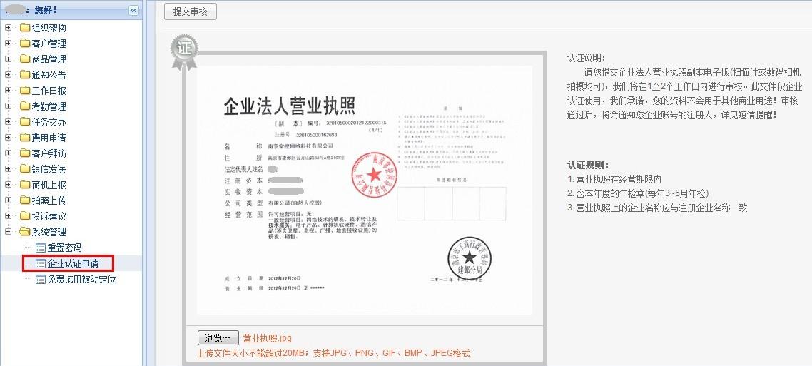 登录到系统之后,在【系统管理】——>【企业认证申请】中,提交我们公司的营业执照;