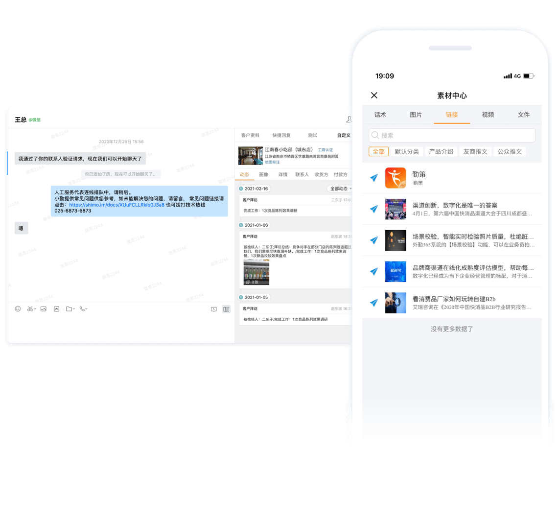 员工在和客户聊天时可以查看客户画像,一键发送营销素材,大大提高跟进客户的效率,企业提供统一素材,也可减少信息传递的损耗。