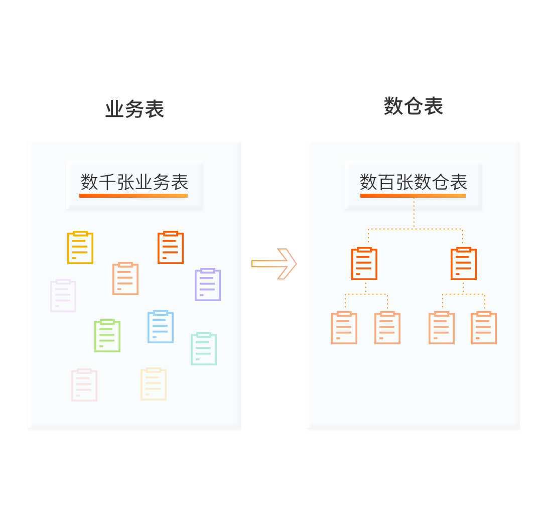 数据仓库的结构按照业务分析要求进行设计,将数千张业务表归纳为数百张数仓表,易于数据分析师和报表开发者理解。